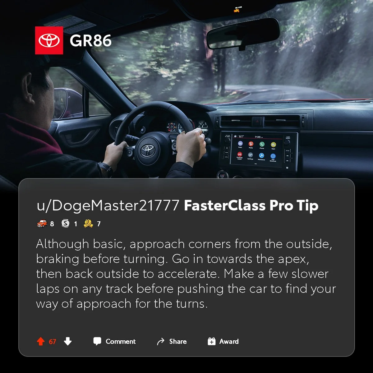 First, Toyota asked adrenaline-fueled drivers to share their best track pro tips, to which we received over 300 responses! We then teamed up with Toyota’s very own professional driver, Ryan Tuerck, to test Reddit’s tips on the track in the new GR86. We filmed the car in action and organized the track pro tips into a full-blown masterclass in track driving. The video and pro tips were scaled across Reddit in both carousel and video, ultimately driving excitement and awareness about the new model.