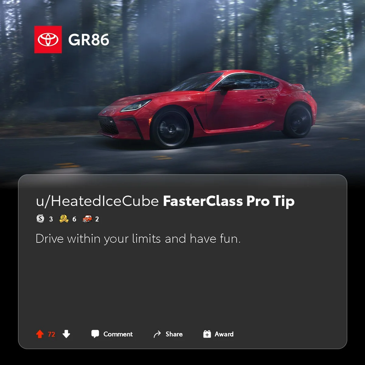 From brand-specific to activity-focused, Reddit is home to thriving car communities. Rather than tell Reddit about the all-new GR86, Toyota wanted to show them. So Toyota launched the GR86 FasterClass: a performance-driving curriculum designed by Reddit, for Reddit.